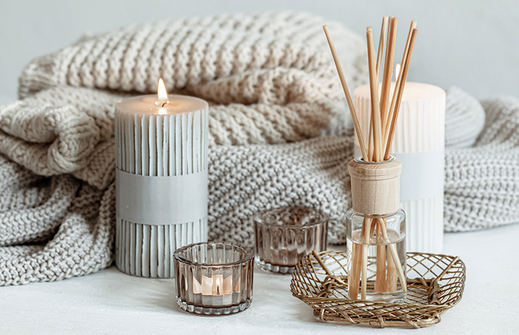 Insert wooden sticks through the perforated plastic layer. The scent then spreads throughout the room via the sticks.